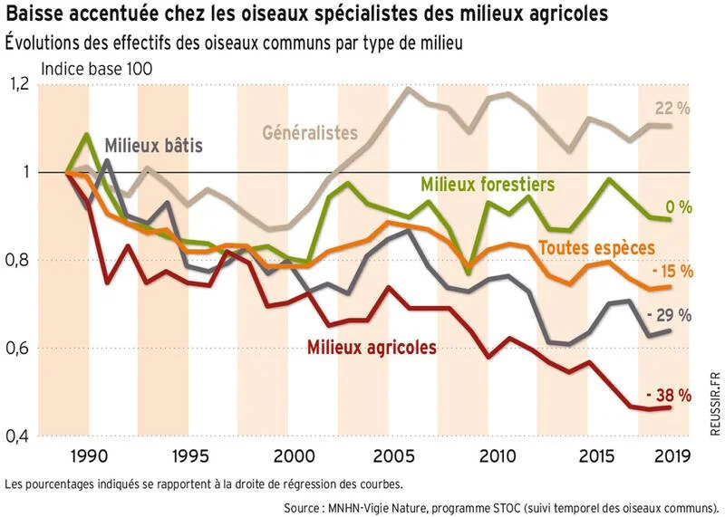 Aussi, la corrélation entre baisse des prairies et déclin de la biodiversité est évidente pour qui s'intéresse aux causes de l'extinction de la biodiversité sur nos territoires et notamment des oiseaux sur les espaces agricoles. Ainsi la disparition des prairies naturelles vient s'ajouter à l'artificialisation des sols, la destruction et le mitage des habitats, l'usage d'intrants chimiques, l'agrandissement de la taille des parcelles, le réchauffement climatique... autant de causes qui expliquent aujourd'hui que nos printemps sont de plus en plus silencieux.
